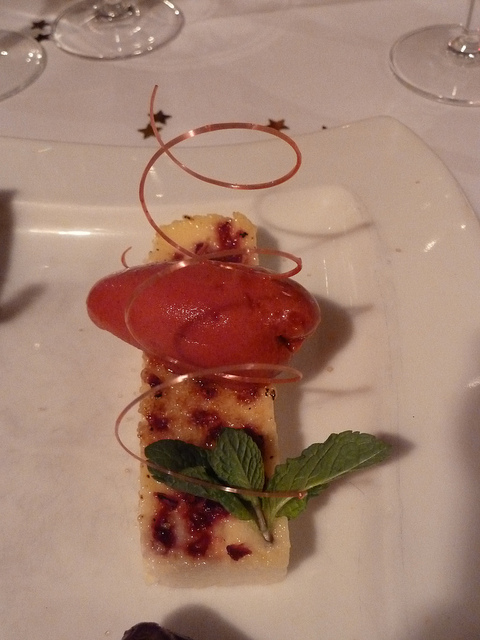 - Dessert - four delicacies including a chocolate sponge with rum or brandy and a small creme brule with raspberry sauce and spun sugar decoration, semi-freddo and a large pitted date